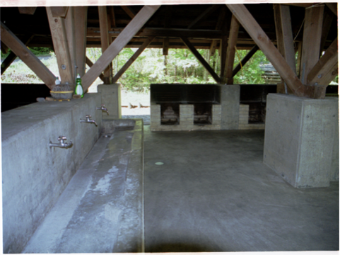 野外炊飯場(夜間照明あり) かまどと、流し台があります。周囲には屋外テーブルも設置しています